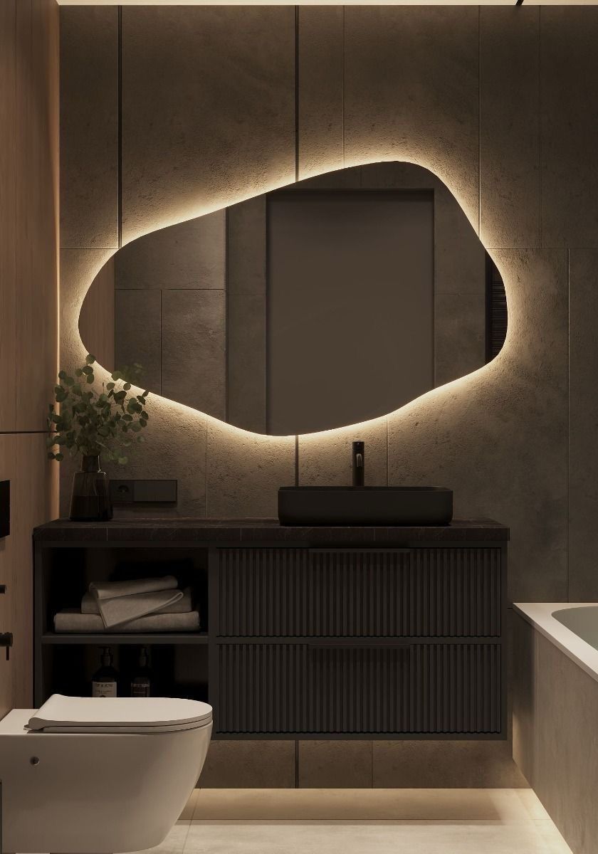 Καθρέπτης μπάνιου κρεμαστός σε σχήμα βότσαλο με φωτισμό led και διακόπτη on/off με τεχνολογία αφής με dimmer και smart λειτουργείες.