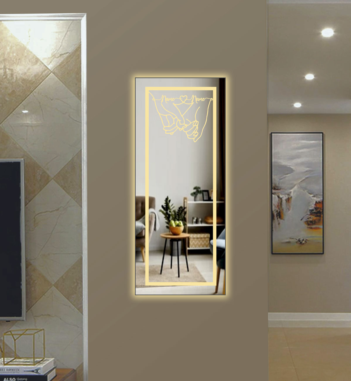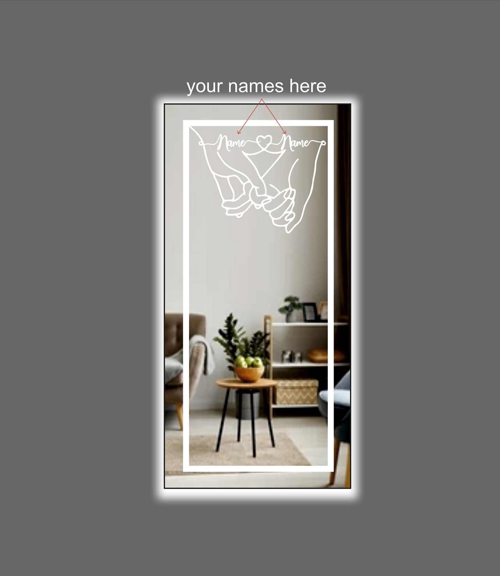 Καθρέπτης τοίχου με led φωτισμό. Κατόπιν τηλεφωνικής ή γραπτής σας επικοινωνίας υπάρχει δυνατότητα να γραφτούν επάνω στον καθρέπτη τα δικά σας ονόματα.