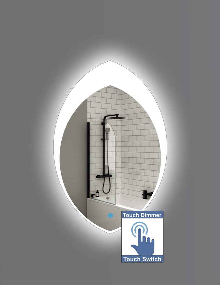 Καθρέπτης Μπάνιου με σχέδιο αμμοβολής σε σχήμα φύλλο με led φωτισμό και διακόπτη on/off με τεχνολογία αφής και dimmer για ρύθμιση της φωτεινότητας.