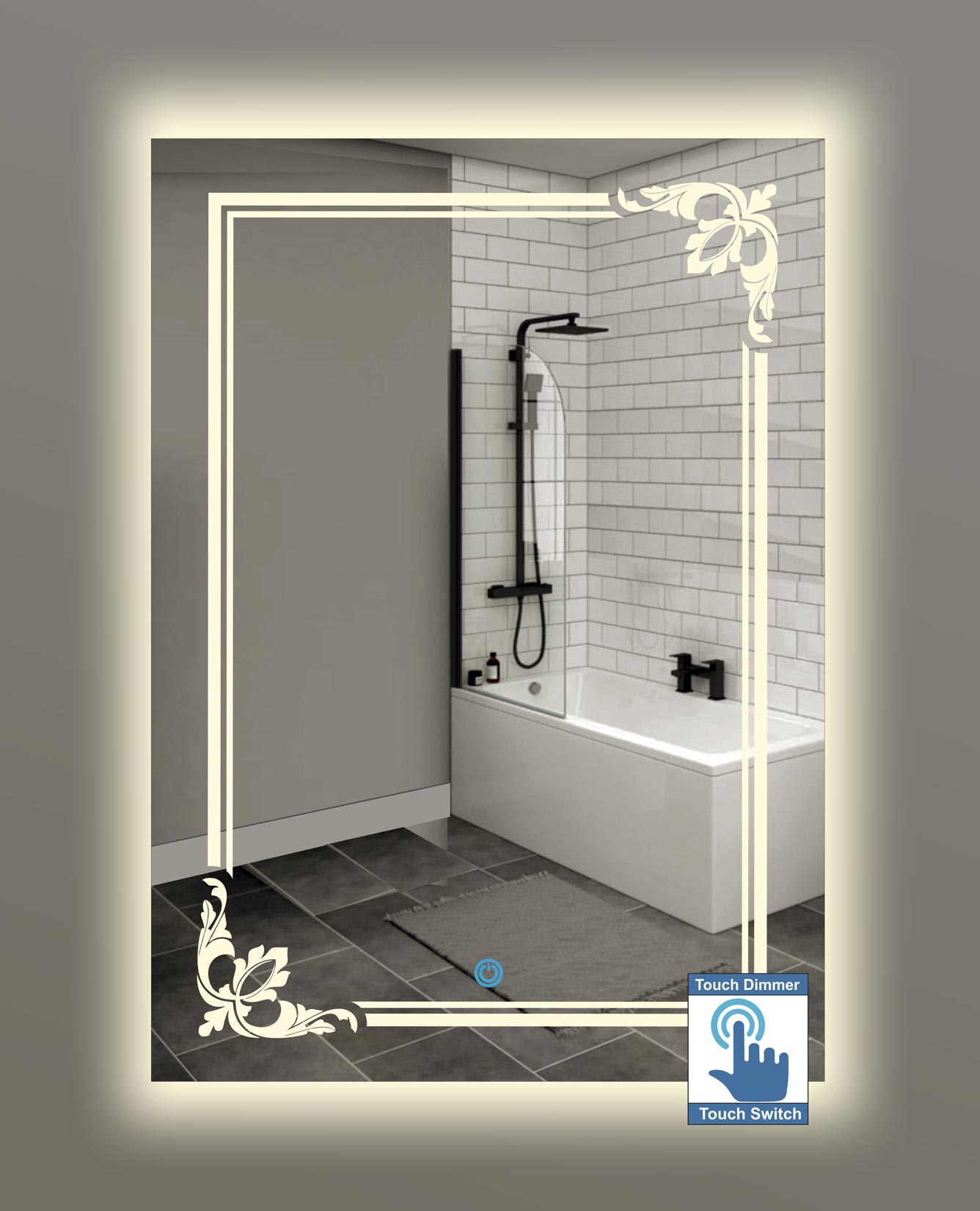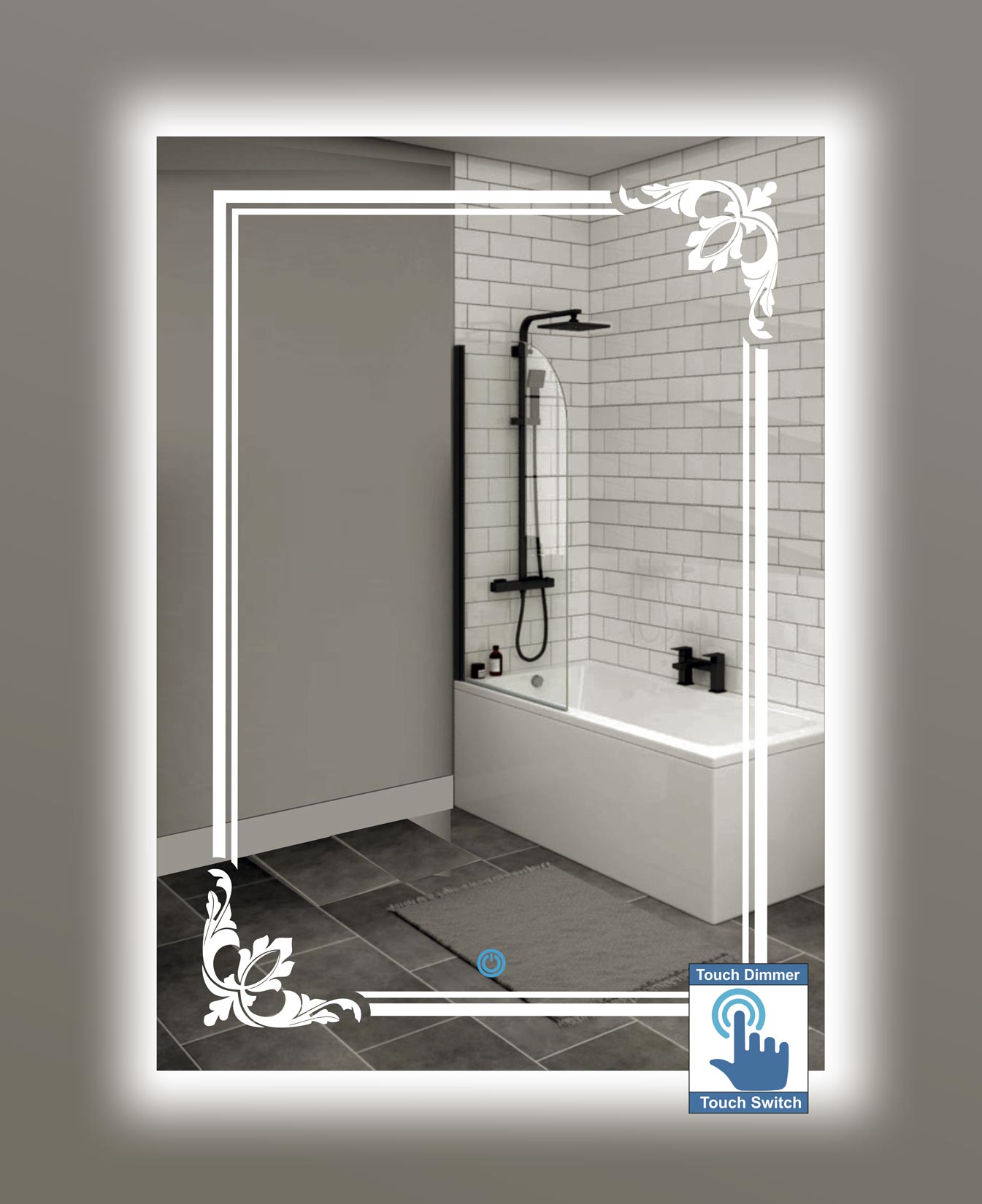 Καθρέπτης μπάνιου, κρεμαστός, ορθογώνιος παραλληλόγραμμος, με σχέδιο αμμοβολής και διακόπτη οn/off αφής με dimmer για ρύθμιση της φωτεινότητας.