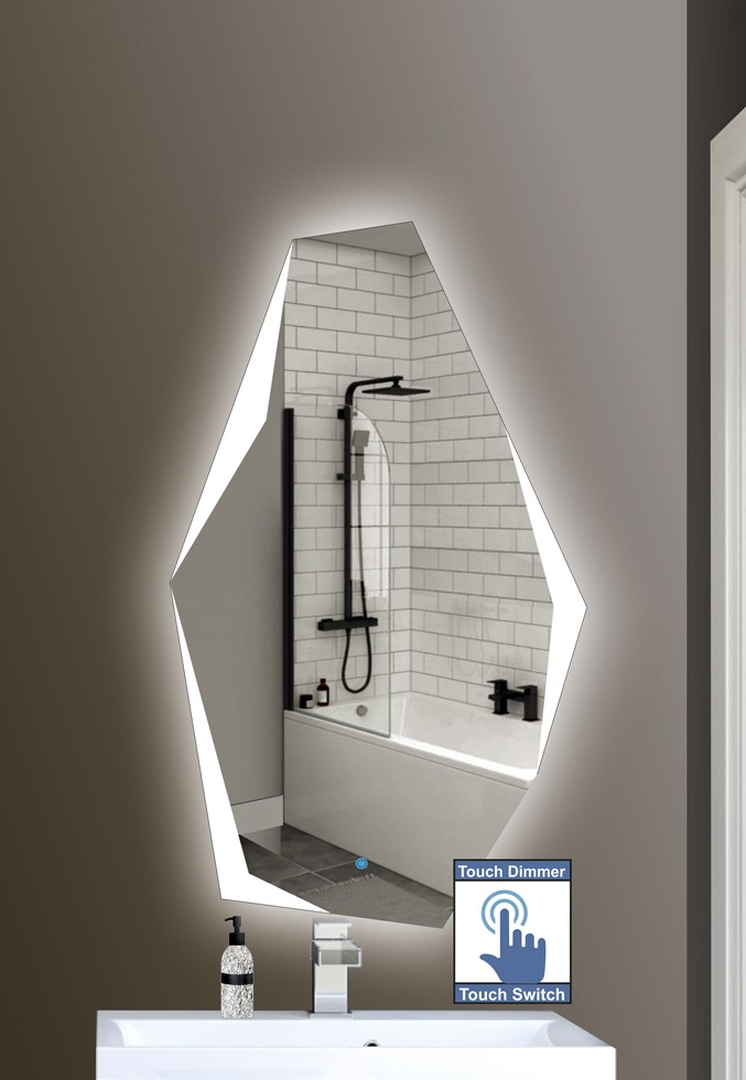 Καθρέπτης μπάνιου μοντέρνος σε πολύγωνο σχήμα και σχέδιο αμμοβολής με Led φωτισμό και διακόπτη on/off με τεχνολογία αφής με dimmer για ρύθμιση της φωτεινότητας.