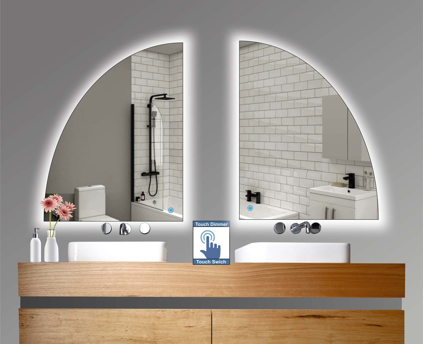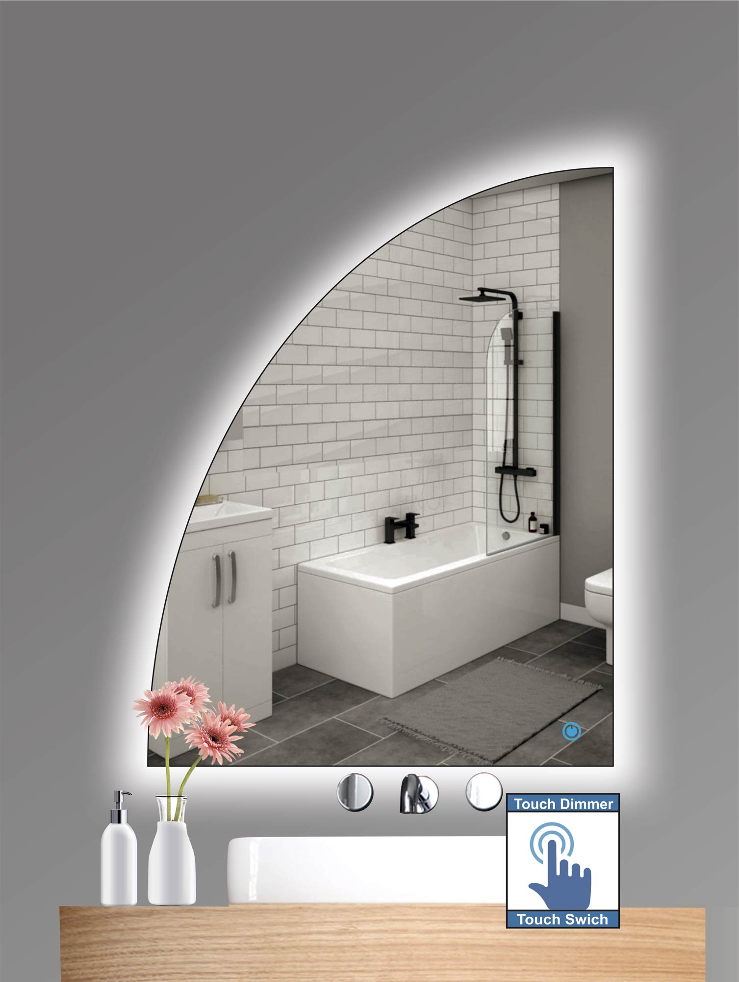 Καθρέπτης μπάνιου σε σχήμα ημικύκλιο (ένα τέταρτο του κύκλου) με led φωτισμό και διακόπτη On/off με τεχνολογία αφής με dimmer για να μπορείτε να ρυθμίζετε την φωτεινότητα σύμφωνα με το χώρο σας.