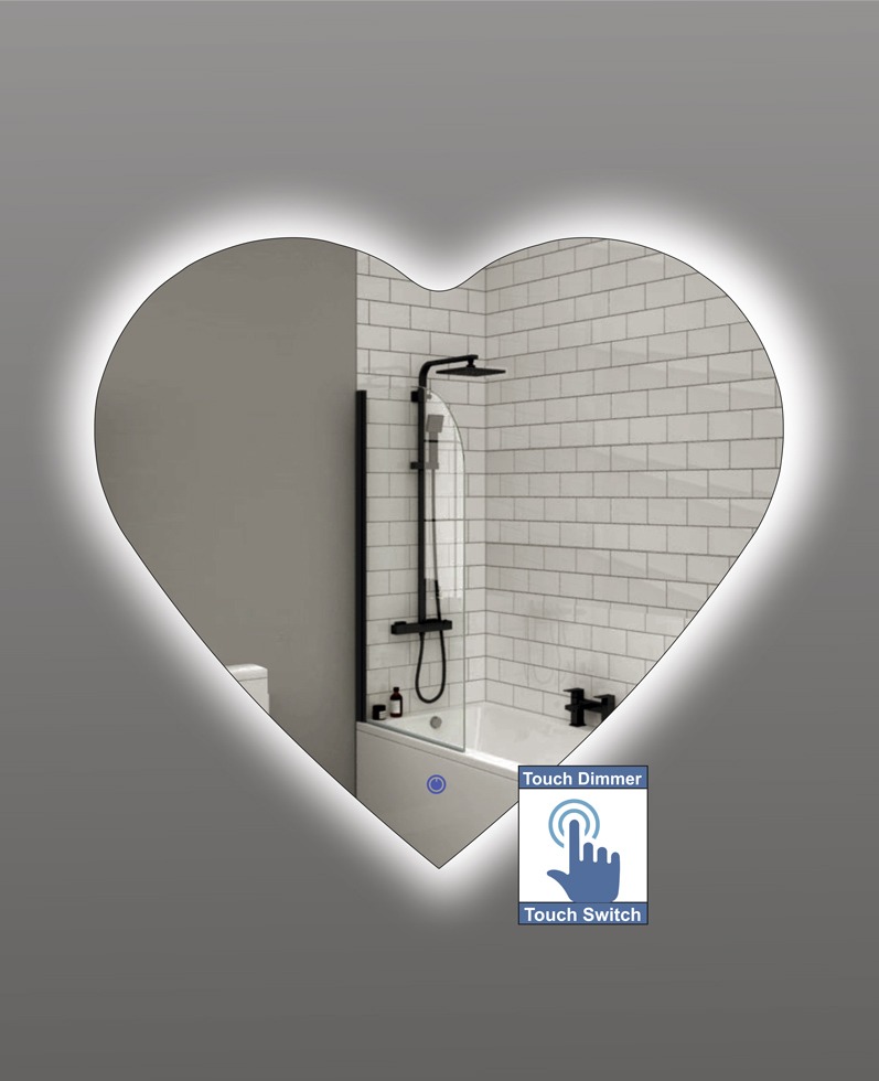 Καθρέπτης μπάνιου σε σχήμα καρδιάς με led φωτισμό και διακόπτη on/off τεχνολογίας αφής με dimmer για ρύθμιση της φωτεινότητας.