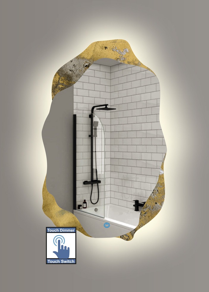 Καθρέπτης μπάνιου-τοίχου με μοντέρνα σχεδίαση χρυσής αμμοβολής και απεριόριστη χρωματική επιλογή σύμφωνα με την διακόσμηση του χώρου σας.