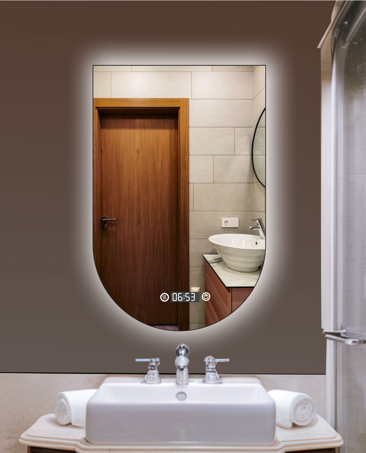 Η πίσω όψη του καθρέπτη αποκαλύπτει τη στιβαρή κατασκευή και την υψηλή ποιότητα των υλικών μας. Με ανθεκτικά στηρίγματα αλουμινίου, ενσωματωμένο μετασχηματιστή και διακόπτη αφής, κάθε λεπτομέρεια έχει σχεδιαστεί για μακροχρόνια χρήση και απόλυτη ασφάλεια.