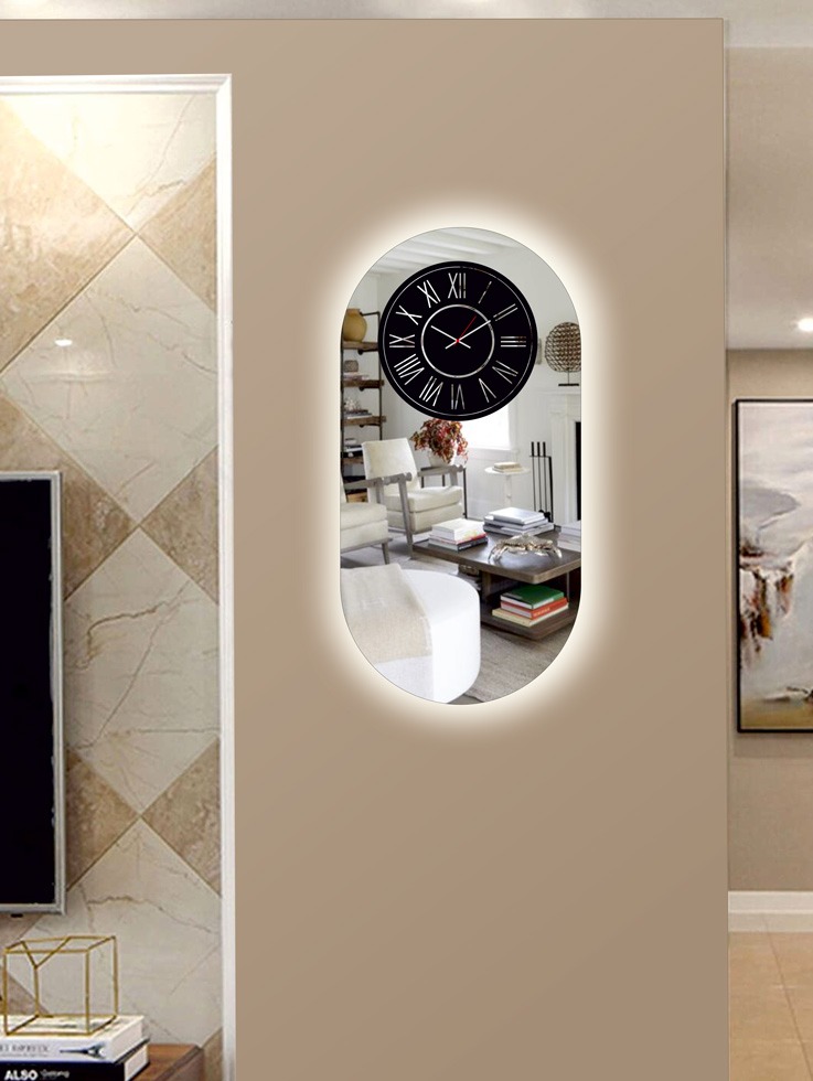 Ρολόι τοίχου καθρέπτης οβάλ με led φωτισμό, ρολόι ακριβείας με αθόρυβο μηχανισμό και λατινικούς αριθμούς σε μαύρο καντράν.