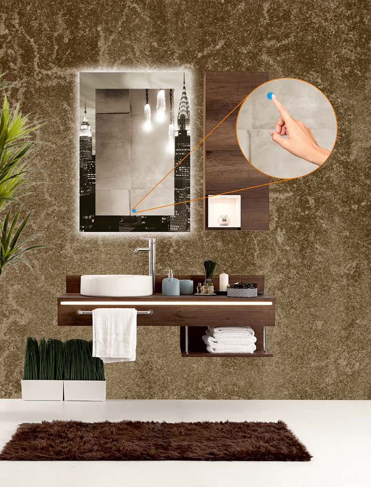 Ο καθρέπτης διαθέτει ενσωματωμένο κρυφό αισθητήρα αφής, (touch metal control sensor) διακριτικά τοποθετημένο στην πίσω πλευρά της κορνίζας, ώστε να παραμένει αόρατος και να διατηρείται η minimal αισθητική του.