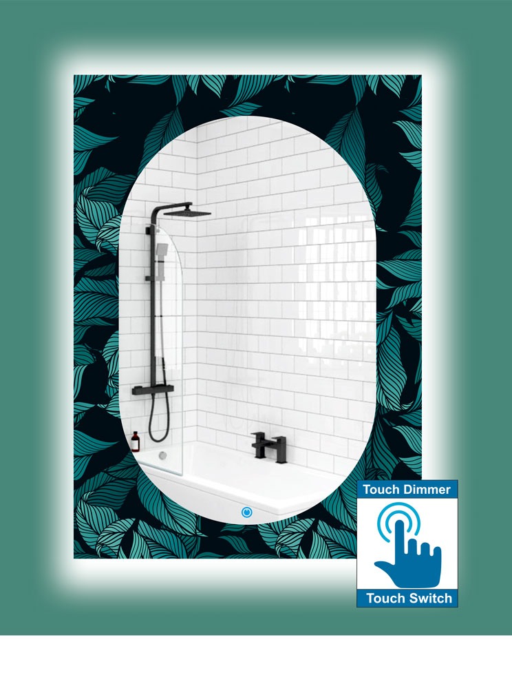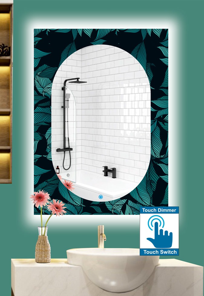 Καθρέπτης μπάνιου κρεμαστός, ορθογώνιος, με ψηφιακή εκτύπωση, με led φωτισμό περιμετρικά και τεχνολογία διακόπτη on/off αφής με dimmer.