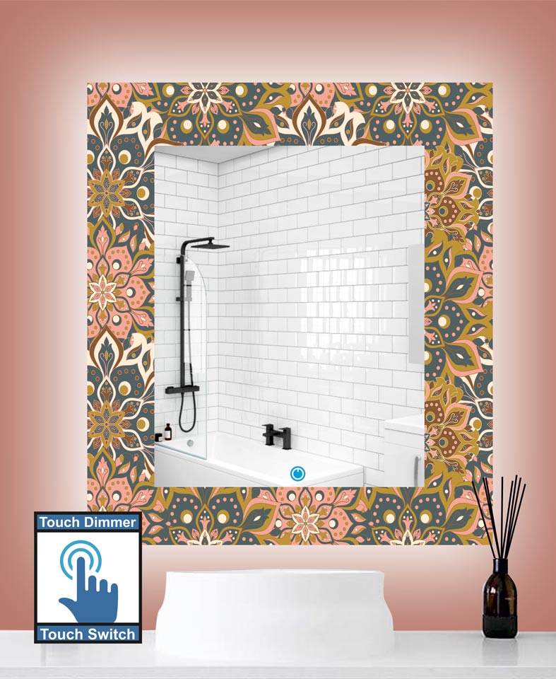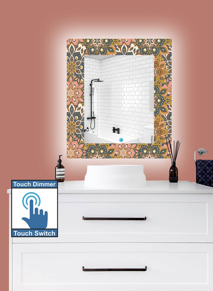 Καθρέπτης μπάνιου κρεμαστός, ορθογώνιος, με τεχνολογία ψηφιακής εκτύπωσης η οποία είναι ανθεκτική στις γρατζουνιές και την υγρασία σε σχέδιο ethnic και διακόπτη οn/off αφής με dimmer.