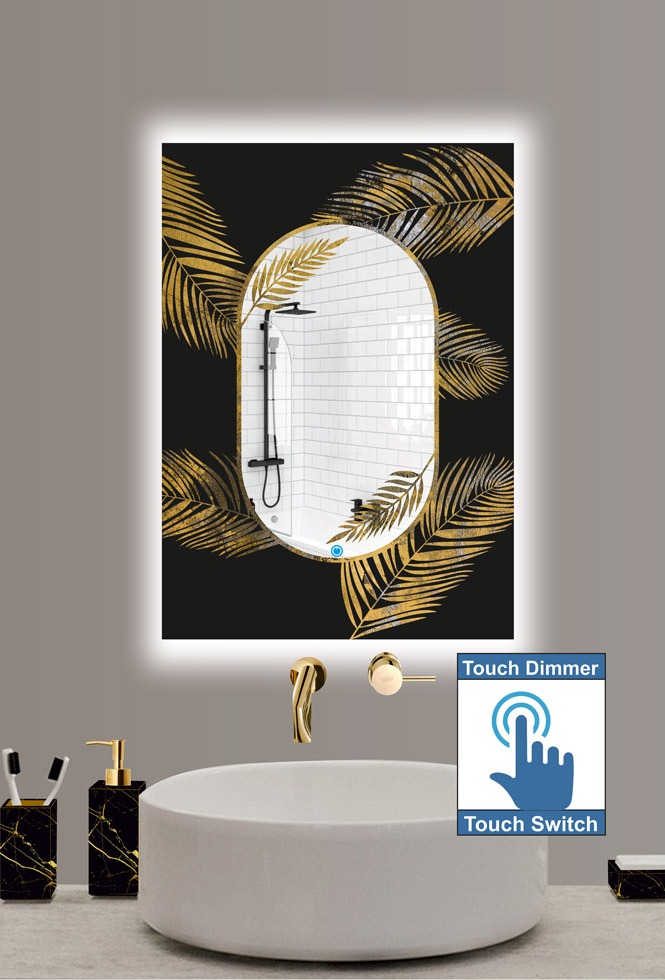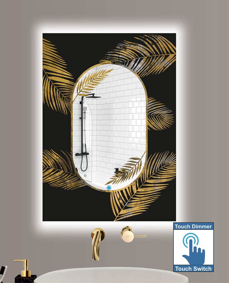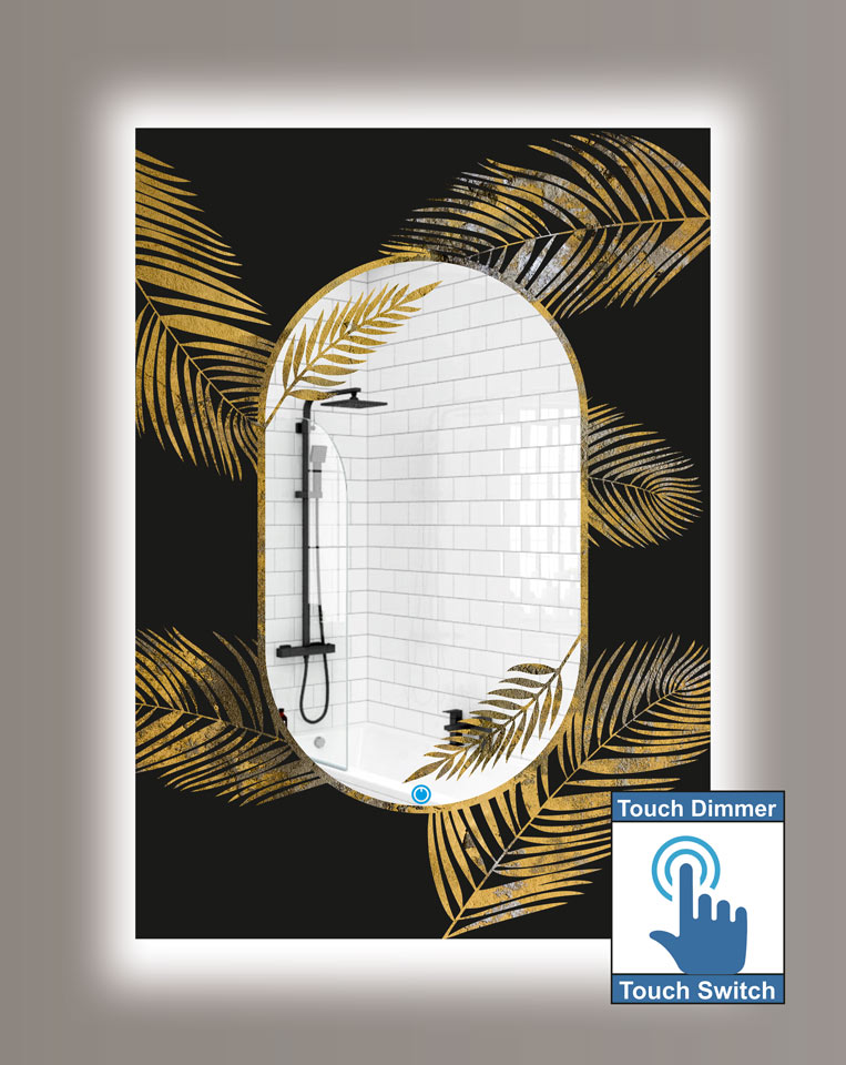 Καθρέπτης μπάνιου κρεμαστός, σχέδιο οβάλ με ψηφιακή εκτύπωση, με led φωτισμό περιμετρικά και τεχνολογία διακόπτη on/off αφής με dimmer.