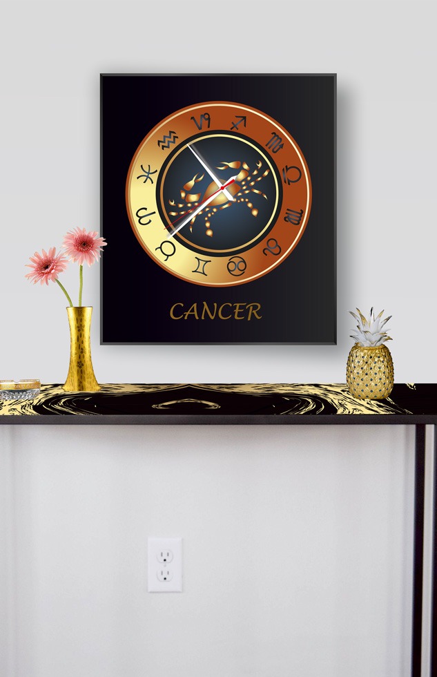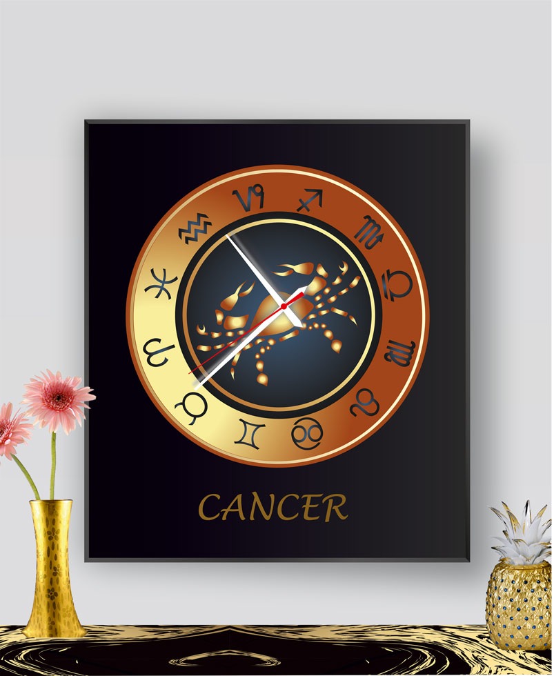 Ρολόι τοίχου ζώδια Καρκίνος με μαύρο πλαίσιο αλουμινίου και τεχνολογία ψηφιακής εκτύπωσης σε γυαλί. Διάσταση 65χ55